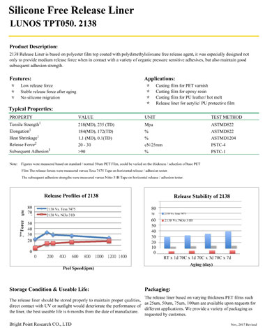 特性/优点:无硅转移、离型力稳定、耐高温、剥离力穏定、离型层结合力好。